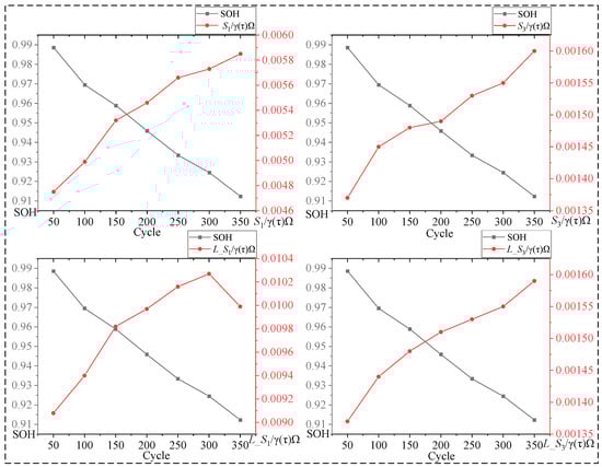 In summary, the inclusion of inductance data does not affect the polarization processes in the impedance data processed by the RDRT method. The changes are primarily reflected in the magnitude of the impedance values. Furthermore, the time constants τ corresponding to the polarization processes S1 and S3 in Figure 7A–D are the same as those for the polarization processes S1 and S4 in Figure 7E–H, indicating that they correspond to the same electrochemical reactions. These two polarization processes are less influenced by SOC changes, and their DRT impedance values exhibit consistent patterns across different cycling numbers. Additionally, the impedance values for S1 and S3 show significant differences under varying cycling numbers and SOC levels. Therefore, it is initially possible to estimate the state of health (SOH) of lithium-ion batteries based on the impedance characteristics at the time constants associated with S1 and S3.