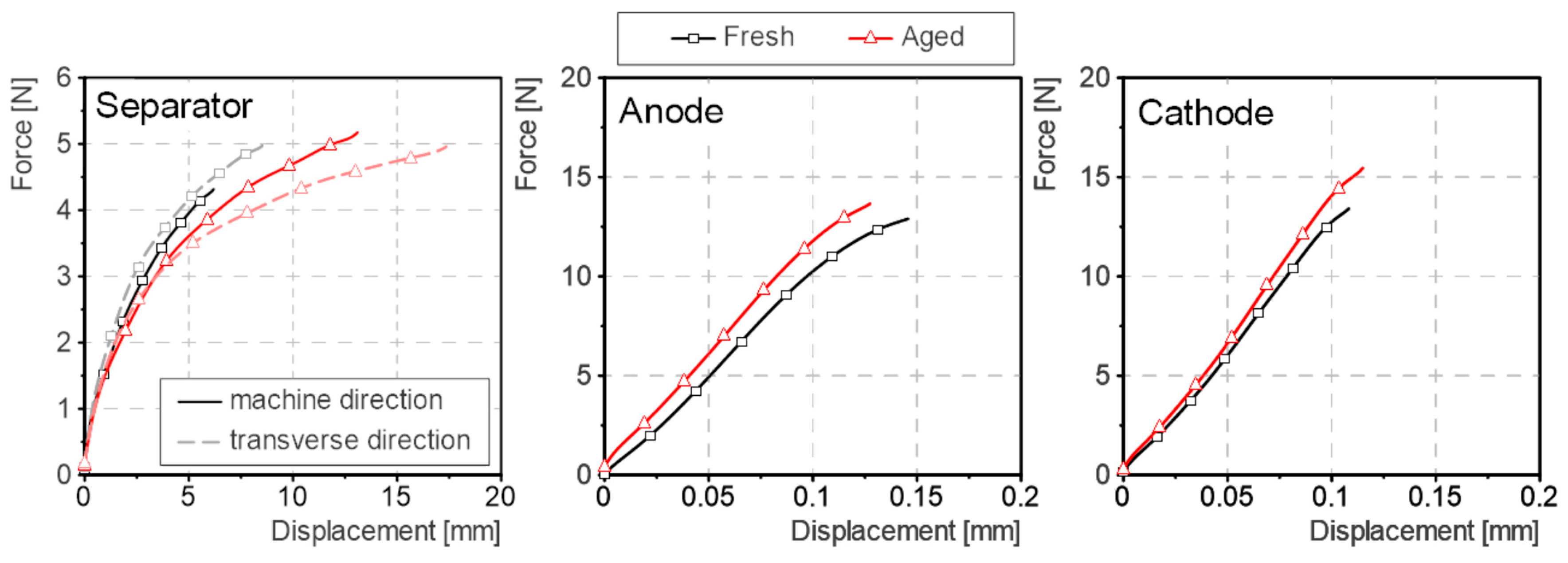 - Uni-axial tensile tests:Tensile tests were conducted to identify possible degradation (e.g., corrosion, cracking [17,21,42]) in the current collectors of the electrodes as well as the properties of the separator. Stripes with a width of 5 mm were cut out of the single components and stored in a replacement electrolyte (dimethyl carbonate DMC). For the separator, samples were created in machine and transverse direction to take into account possible anisotropic behaviour. The samples were clamped with a free length of 15 mm (based on [43]), tested with a speed of 20 mm/min and for each component, five samples were tested. For these tests, a dynamic mechanic analyser (DMA) RSA-G2 (Figure 3a) was used. As results, single force over deflection curves of the five test repetitions as well as respective average data were obtained.