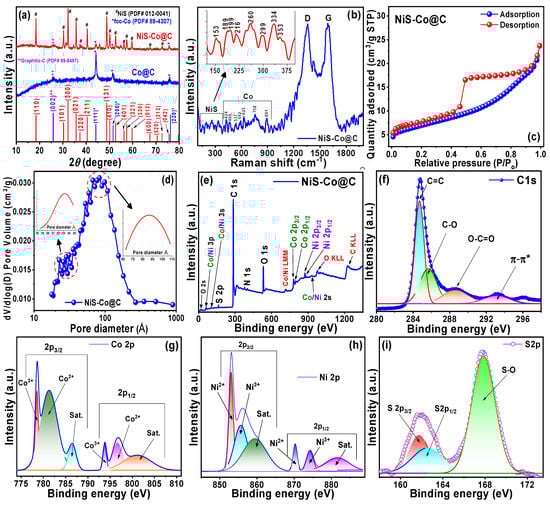 (a) XRD, (b) Raman, (c) N2 adsorption-desorption, (d) pore size distribution, (e) XPS survey spectrum, (f) core level C 1s, (g) Co 2p, (h) Ni 2p, and (i) S 2p spectrum.