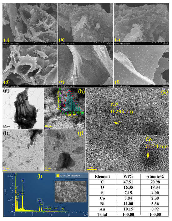 Scanning electron microscopic (SEM) images of Co@C and NiS-Co@C samples are shown in Figure 2a–c and Figure 2d–f, respectively. Both samples feature curly shaped, highly porous hierarchical nanostructures, which, at higher magnifications, reveal 2D nanosheet-like structures, with the NiS-Co@C sample showing larger pores. In particular, the NiS-Co@C sample exhibits a uniform deposition of NiS nanoparticles within the Co@C matrix, enhancing the redox activity of the electrode for improved electrochemical performance. This is further supported by transmission electron microscopic (TEM) images of NiS-Co@C (Figure 2g–j) at four different magnifications, where the highly porous nanosheet-like structures and the NiS nanoparticle deposition are clearly visible. The size distribution of the NiS nanoparticles (shown in the inset of Figure 2h) shows a peak size of approximately 30 nm. Additionally, the high-resolution (HR) TEM micrograph in Figure 2k reveals the high-crystallinity of NiS and Co lattice planes, with well-defined lattice spacings. Figure S2a–e and Figure 2l show the EDX mapping/spectrum and elemental compositions of Co@C and NiS-Co@C, respectively, which reveal the uniform presence of the corresponding elements [34,38]. The compositional analyses depict that, for the NiS-Co@C sample, there is a slightly excessive sulfur incorporation (similar to XPS data), which may create defects to improve redox activity. For both the electrodes, considerable incorporation of Co indicates its positive contribution towards the electrochemical performance via enhanced redox activity as well as enhanced charge–transport properties. Additionally, the considerable presence of oxygen indicates the remnant CO2 absorption during sample preparation and handling. The presence of Au is due to the gold-coating used on the sample for proper electron microscopic imaging. The trace amount of K in the Co@C sample is likely a result of impurities from the cooked rice, often introduced through fertilizers. However, during the hydrothermal reaction with NiCl2 and thioacetamide, it was likely removed, and hence, no elemental K is observed in the NiS-Co@C sample.