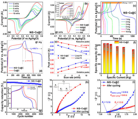 (a) CV of NiS-Co@C at different scan rates, (b) comparison of the CV between NiS-Co@C, NiS@C, Co@C, and NiS electrodes (inset: CV for the carbon matrix), (c) GCD of NiS-Co@C at different specific currents, (d) comparison of the GCD between NiS-Co@C and Co@C electrodes, (e) variation of peak currents against scan rates, (f) determination of specific capacity at different specific currents, (g) cyclic stability test of the NiS-Co@C electrode (inset: 1st and 5000th GCD cycles), (h) Nyquist plots of the NiS-Co@C electrode before and after the stability test (inset: equivalent circuit), and (i) high-frequency intercept of the Nyquist plots and the real impedance axis.