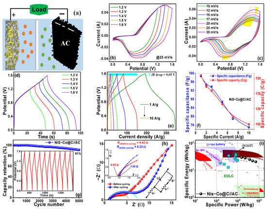 However, as previously noted, since Equations (3) and (4) should not be interpreted in terms of battery-type or capacitor-type mechanisms, the hybrid supercapattery behavior of the device is analyzed based on the characteristics of the individual electrodes obtained from the three-electrode system and then compared with the CV and GCD profiles of the two-electrode device. It is evident that the dominant battery-type behavior of the NiS-Co@C positive electrode (characterized by strong redox peaks with minimal integral area in CV profiles, as shown in Figure 3a, and nonlinear GCD profiles with extended plateaus, as seen in Figure 3b) and the EDLC behavior of the carbon negative electrode (characterized by near-rectangular CV curves and triangular GCD profiles) are combined in the two-electrode system, resulting in quasi-rectangular CV curves with well-resolved redox peaks (cf. Figure 4c) and nonlinear GCD profiles with long plateaus (cf. Figure 4e). This suggests a hybrid mechanism involving both the redox-controlled, diffusion-driven battery-type process in the NiS-Co@C positive electrode and the surface-controlled, capacitive EDLC process in the AC negative electrode, thereby reinforcing the hybrid supercapattery behavior of the device. Therefore, the classification of the device as a supercapattery is supported by the combination of the battery-type and the capacitor-type processes, confirming the unique hybrid supercapattery mechanism [43,44,45,46,47].