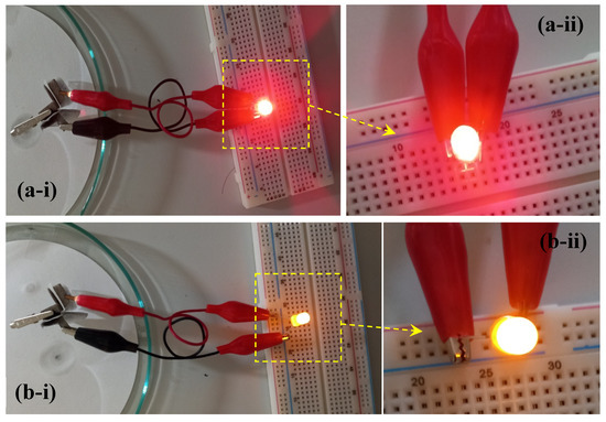 (a-i) Illumination of a red LED by series-connected pouch-cell type hybrid supercapattery device, (a-ii) close-up view, (b-i) illumination of an orange LED, (b-ii) close-up view.