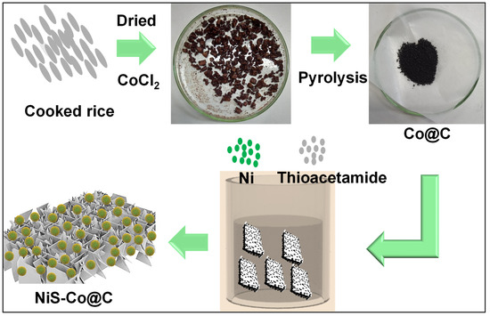 The methodology of synthesis includes mainly two-step pyrolysis–hydrothermal treatment. Before pyrolysis, the CoCl2 (2 mM) metal precursor was first dissolved in 10 mL of water. Then, dried cooked rice was added to the mixer to fully absorb the metallic water, which was further dried at 100 °C for 5 h. The dried product was pyrolyzed at 800 °C in a N2 atmosphere for 2 h to obtain the Co nanoparticle-encapsulated porous carbon. This Co@C powder was further transferred to the mixer of Ni and thioacetamide precursors with a ratio of 1:1. The solution was then transferred to the Teflon-coated autoclave and maintained a hydrothermal temperature of 180 °C for 10 h. After completion of hydrothermal treatment, the resulting product was rinsed with water and ethanol multiple times, then dried at 70 °C for 8 h. The obtained NiS-Co nanosheet-nanoparticle-encapsulated porous carbon was used for characterizations and electrochemical studies. The total process is schematically presented in Scheme 1, shown below.