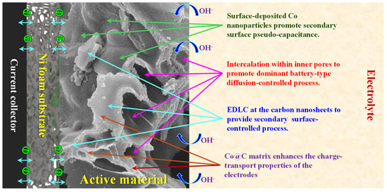 Hence, as discussed earlier, several key factors contribute to the superior electrochemical performance of the NiS-Co@C electrodes: (1) Primary Effect of Ion Intercalation and Battery-Type Behavior: The abundant voids and nanopores in the nanosheet structure facilitate deep ion penetration, enabling a primarily diffusion-controlled, battery-like charge storage mechanism. (2) Secondary Capacitive Contribution from the Carbon Matrix: The conductive carbon framework supports an electric double-layer capacitance (EDLC) process, enhancing charge storage. (3) Secondary Surface-Pseudocapacitance from Co Nanoparticles: Surface-deposited Co nanoparticles introduce additional pseudocapacitive behavior in the NiS-Co@C electrode, promoting a secondary surface-controlled charge storage mechanism that further boosts electrochemical performance. (4) Redox-Active Sites and Fast Charge Transfer: The presence of abundant NiS nanoparticles provides multiple oxidation states and large number of defect centers, promotes numerous redox-active sites, and shortens ion diffusion pathways, facilitating rapid Faradaic reactions. (5) Improved Charge Transport: The Co@C matrix enhances electrical conductivity, optimizing charge transport across the electrode structure. These synergistic effects collectively lead to enhanced electrochemical properties of the NiS-Co@C electrode. A schematic representation of the charge storage mechanism is provided in Scheme 2.