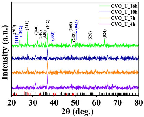XRD spectra of Co3V2O8 nanoparticles at 4 h, 7 h, 10 h, and 16 h of hydrothermal reaction time.