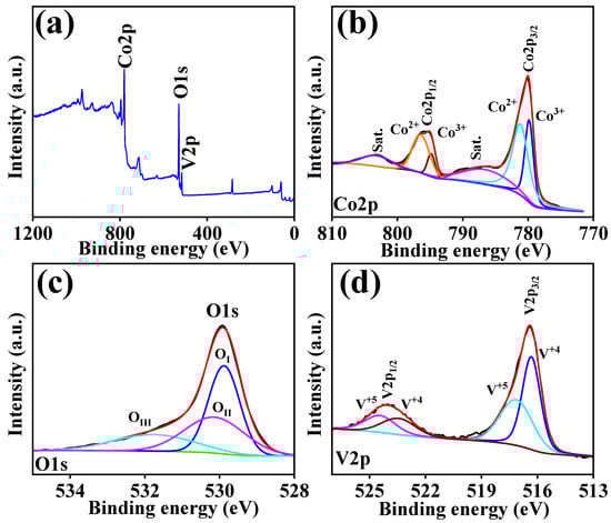 XPS spectra of CVO_U_10h nanoparticles: (a) survey, (b) cobalt, (c) oxygen, and (d) vanadium.