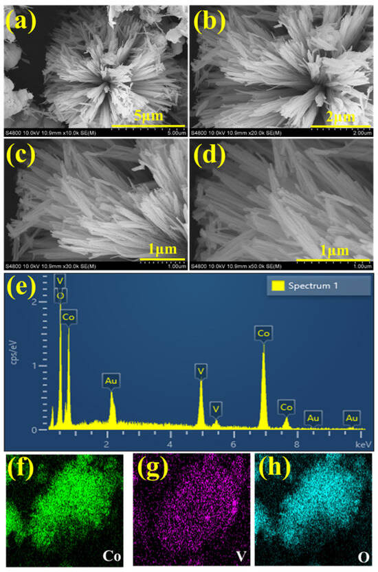 (a–d) FESEM micrographs at different magnifications, (e) EDS spectra, and (f–h) elemental mapping of CVO_U_10h nanowires.