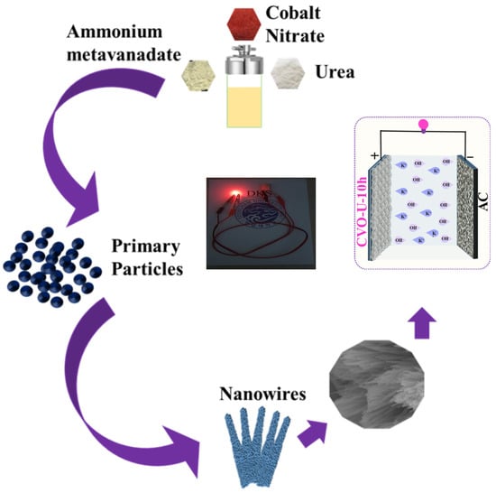 A simple hydrothermal process was used to prepare Co3V2O8 nanowires. To begin the synthesis, 40 mL of water was mixed with 4.8 mL of cobalt nitrate, 7.2 mL of ammonium metavanadate, and 2.24 mL of urea to form a homogenous solution. After stirring, the entire solution was transferred and carefully sealed into a 100 mL Teflon liner reactor. The hydrothermal reactor was then placed in a fan-forced furnace for 4 h to maintain a temperature of 140 °C. After the reaction was completed, the reactor was allowed to cool naturally to ambient temperature. After cooling, the produced product was filtered through filter paper and the residue was washed with water and ethanol several times. The washed Co3V2O8 powder was dried overnight at 60 °C. Following the drying procedure, the Co3V2O8 powder was annealed at 400 °C for 4 h. After drying, the Co3V2O8 powder was given the designation CVO_U_4h. The reaction mechanism for the formation of Co3V2O8 nanowires is represented by reactions (1)–(4) [47]. A similar approach was used for the synthesis of Co3V2O8 powder at 7 h, 10 h, and 16 h of hydrothermal reaction time, and the products were called CVO_U_7h, CVO_U_10h, and CVO_U_16h, respectively. Co3V2O8 nanowires prepared for different hydrothermal reaction times were utilized for further characterization and study with similar nomenclature.