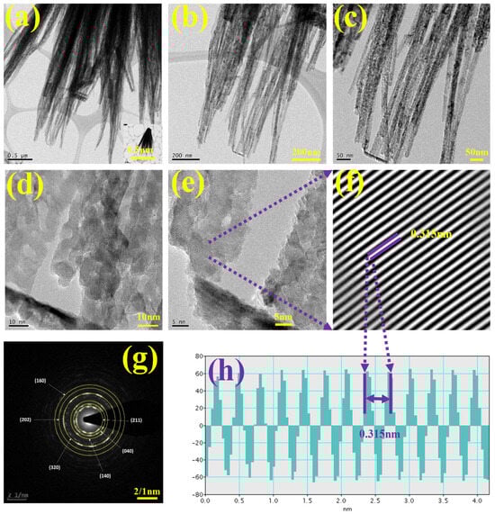 (a–d) TEM at different magnifications, (e,f) d-spacing image, (g) SEAD pattern, (h) FFT pattern for d-spacing CVO_U_10h nanoparticle.
