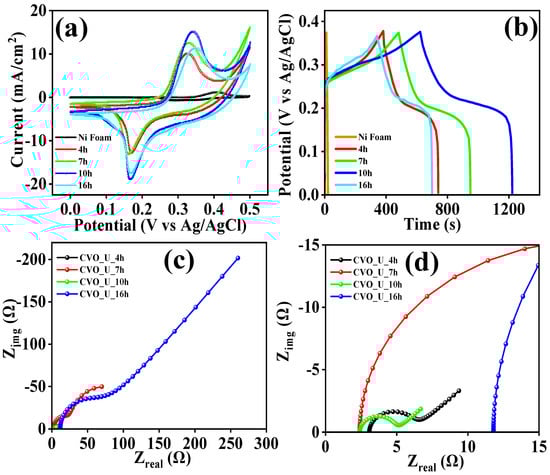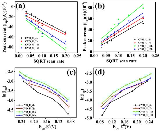 The electrochemical analysis of all the CVO_U electrodes was carried out in a 2M KOH electrolyte using cyclic voltammetry and galvanostatic charge–discharge measurements. Figure S4 depicts the CV profiles of all CVO_U electrodes. The area under the curve grows with increasing hydrothermal reaction time, as shown in Figure 6a. The electrode’s energy storage capacity rises with increasing area. All electrodes show distinct redox peaks, demonstrating charge storage via pseudocapacitive behavior. The redox peaks shift as the scan rate increases, indicating fast and reversible redox kinetics, a characteristic of pseudocapacitive behavior [52]. As shown by the CV profile, the hydrothermal reaction period influences the surface microstructure of CVO_U nanowires. Nanowires grow after 4 h of hydrothermal processing, giving additional active sites for redox reactions. With a 7-h reaction, nanowires link sideways, increasing interaction, as can be seen in the CV profile of the CVO_U_10h electrode, which has an expanded area in the CV profile curve, as shown in Figure S4c. Nanowire bundles with a large active surface area provide a grown conjunction and a large active surface area for a 10-h hydrothermal reaction. Figure 6a depicts the area of the CV profile impacted by the hydrothermal reaction time. When compared to the other electrodes, the area under the curve for the 10-h hydrothermal reaction was larger, indicating superior energy storage capabilities. In a 16-h reaction, however, the nanowire size increases, resulting in a loss in active surface area and storage capacity. The electrode prepared in a 10-h hydrothermal reaction has a void space with connected nanowire CVO nanoparticles which provide a high energy storage capacity, making it an attractive electrode material for energy storage applications. The CV profiles of all electrodes were employed to examine the kinematics of their electrochemical characteristics in more depth. The charge distribution was calculated using the ‘b’ value, which reflects two different charge storage processes, namely, capacitive and diffusive processes. In this case, ‘b’ = 1.0 for the capacitive process and ‘b’ = 0.5 for the diffusive process. Charge storage via diffusion and capacitive processes is indicated by values of 0.5 < b < 1.0. The following equations were used to calculate the b values from the CV profiles: