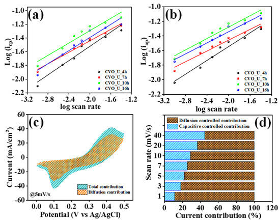 The values were calculated using a log(i) vs. log(v) plot, as shown in Figure 7a,b, where ‘v’ is the scan rate and ‘i’ is the peak current corresponding to the scan rate. The ‘b’ values for the CVO_U_10h electrode are 0.44 and 0.39 for the cathode and anode, suggesting that the diffusion process dominates in the charge process. This might be ascribed to the bundle-like microstructures containing void spaces, which allow electrolyte ions to easily diffuse during the charge and discharge processes [53,54]. The computation of the b value reveals the combined capacitive and diffusion processes. At constant potential, the total current in a CV profile is caused by pseudo capacitance from diffusion-controlled contributions and double-layer capacitance from surface-controlled contributions. These contributions are calculated using the formulae below.
