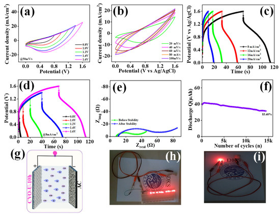 Here, A represents the electrode area, C represents the electrolyte concentration, v represents the scan rate, R represents the universal gas constant, T represents the absolute temperature, F represents Faraday’s constant, D represents the diffusion constant, α represents the transfer coefficient, n represents the number of moles participating in the chemical reaction, Ep represents the peak potential, and E0 represents the formal potential. The transfer rate constant (k0) was explored to analyze electrochemical kinetics and establish the nature of the reaction process, whether reversible, irreversible, or quasi-reversible. As illustrated in Figure 8c,d, the k0 values were determined using the cyclic voltammetry (CV) profile using the peak current and corresponding potential. Depending on the value of k0, it may be feasible to identify whether the reaction is irreversible, reversible, or quasi-reversible. k0 > 10−1 for reversible chemical processes and k0 < 10−5 for irreversible chemical reactions. Chemical reactions with 10−1 < k0 < 10−5 are categorized as quasi-reversible. All electrodes have k0 values ranging between 10−1 and 10−5, implying that the charging and discharging processes are quasi-reversible. The transfer coefficient α is computed and listed in Table 1, and outcomes vary between 0.22 and 0.30, implying that the reaction is quasi-reversible. The areal capacitance, areal energy density, and areal power density of all CVO_U electrodes were calculated from the GCD profile and Equations (10)–(12). Figure S5 shows the GCD profiles of all the electrodes. The charging and discharging times of all electrodes were altered in accordance with the surface microstructural changes induced by the hydrothermal reaction time. The surface microstructure of the nanowires exhibited a shorter discharging time when compared to the other electrode, as shown in Figure 6b. The nanowire microstructure demonstrated a progressive expansion as the hydrothermal reaction time reached 7 hours, resulting in extended charging and discharging durations, potentially attributed to the development of a wire network through lateral joining. When the hydrothermal reaction time is increased to 10 h, the nanowires begin to form bundles, and empty spaces arise between the bundles. The void spaces between the bundles are beneficial for charging and discharging the ions, and their effects were observed in the GCD profile shown in Figure 6a. The CVO_U_10h electrode showing the longer charging and discharging times demonstrated excellent areal energy density and power density. For the hydrothermal reaction time of 16 h, the thickness of the nanowires increased and the void spacing between the bundles decreased, decreasing the charging and discharging times. Overall, the electrode prepared with a 10 h hydrothermal reaction shows excellent charging and discharging times, possibly due to the uniform nanowire microstructure with bundle arrangement and void spaces between the bundles. The areal capacitance, areal energy density, and power density of the electrode were calculated using Equations (10)–(12) [55,56]. The CVO_U_10h electrode shows an areal capacitance of 4.67 F/cm2 at a current density of 3 mA/cm2, with an energy density of 94 μWh/cm2 and a power density of 573 μW/cm2. The rest of the electrodes areal capacitances, energy densities, and power densities are listed in Table 2. In an electrochemical cell, electrochemical impedance spectroscopy was employed for assessing solution resistance (Rs) and charge transfer resistance (Rct). Rs is the solution resistance originating primarily from ion transfer resistance through an interface between the electrolyte and electrode material, estimated using a Nyquist plot at the low-frequency intercept on the x-axis. Rct is the charge transfer resistance measured from the semicircle diameter in the EIS spectra. Figure 6c,d illustrates the EIS spectra of all CVO-U electrodes in the frequency range of 105 to 10−1 Hz. In the EIS investigation, the impact of hydrothermal reaction time on surface morphological tailoring was observed. At first, nanowires were observed in FESEM, and the electrode exhibited an Rs of 3.01 Ω and an Rct of 3.91 Ω, which might be attributable to the nanowire microstructure of the CVO_U_4h electrode. Once the reaction period extended to 7 h, the surface microstructure was tailored to establishing nanowires that were connected laterally to each other, and some nanowires formed looping structures, resulting in a network-like microstructure. The series resistance of the electrode fell to 2.09 Ω owing to lateral linking; however, Rct rose, probably due to the connection of the nanowire tips in the CVO_U_7h electrode. This impact was found in the GCD analysis, particularly the capacitance study. Following a 10-h hydrothermal reaction duration, nanowires continued to form bundles with the highest lateral linking and void spacing between bundles, and all wire tips were free. The series resistance (Rs) and charge transfer resistance (Rct) of the CVO_U_10h electrode decreased to 2.01 Ω and 2.24 Ω, respectively, due to substantial lateral linking and free ends of the nanowires, and this impact was noticed in the GCD profile due to an increase in charging and discharging times. The tiny values of Rs and Rct may improve the electrode’s charging and discharging time. As the hydrothermal reaction time rose to 16 h, dense bundles with increasing nanowire thickness were identified, affecting ion diffusion, as well as Rs and Rct values, and originating in a drop in specific capacitance in the GCD profile. The CVO_U_10h electrode possessed the lowest Rs and Rct values compared to the other electrodes, which might be due to laterally connected nanowires producing nano bundles with void spacing and demonstrating good supercapacitor performance. The values of Rs and Rct are listed in Table 2.