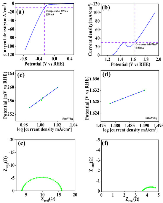 (a,b) LSV plot, (c,d) Tafel plot, (e,f) EIS spectra of OER and HER for the CVO_U_10h electrode.