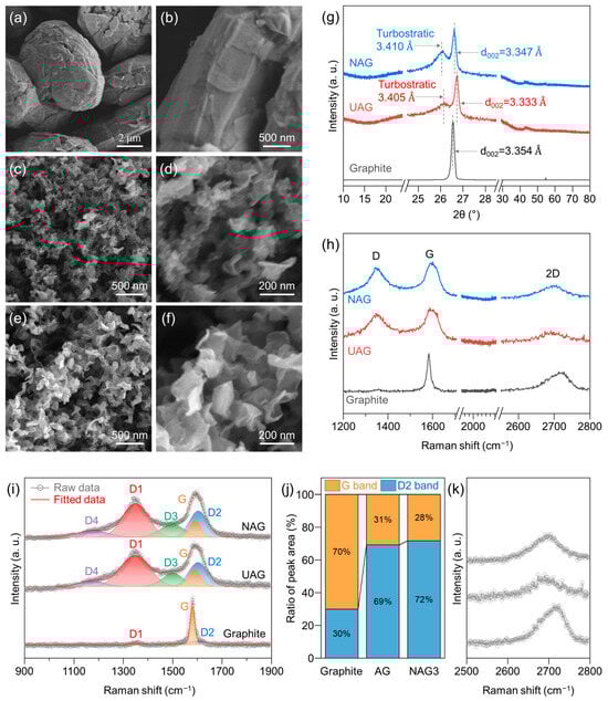 FE-SEM surface images: (a,b) graphite, (c,d) UAG, and (e,f) NAG samples, (b,d,f) images are magnified of (a,c,e) images. (g) XRD patterns and (h–k) Raman data for three samples: (h) Raman spectra, (i) deconvoluted spectra showing D1–D4, and G bands to investigate the disorder in the graphitic structure, (j) ratio of the peak area of the D2 band to the G band, and (k) magnified spectra highlighting the 2D band for graphite, UAG, and NAG.
