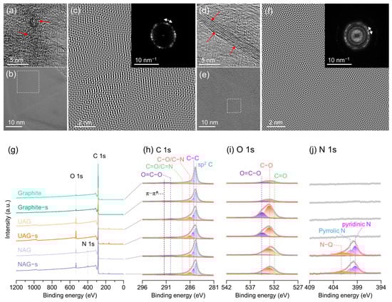Transmission electron microscope (TEM) results of UAG: (a,b) high-resolution TEM image, (c) corresponding fast Fourier transform (FFT) image for the square dotted line of (b) [inset in Figure 2c] and inversed fast Fourier transform (IFFT) image. TEM results of NAG: (d,e) high-resolution TEM image, (f) corresponding FFT image for the square dotted line of (e) [inset in Figure 2f] and IFFT image. (The red arrows represent the defect sites.) XPS spectra of artificial graphite, UAG, and NAG samples before and after surface Ar+ sputtering (XPS spectra after sputtering were marked as ‘−s’): (g) survey-scan, (h) C 1s, (i) O 1s, and (j) N 1s, respectively.