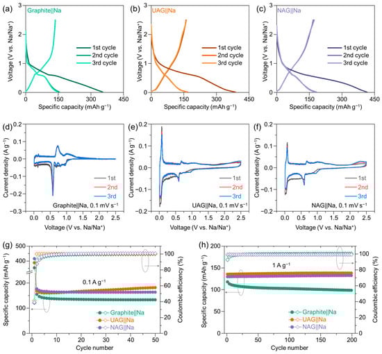 Electrochemical performances of the electrodes. (a–c) Galvanostatic charging/discharging plots during the initial three cycles for the three electrodes at a current density of 0.1 A g−1: (a) graphite, (b) UAG, and (c) NAG. (d–f) Cyclic voltammetry curves during the initial three cycles for the three electrodes at a scan rate of 0.1 mV s−1: (d) graphite, (e) UAG, and (f) NAG. (g,h) Cycling performance for graphite‖Na, UAG‖Na, and NAG‖Na half-cells at (g) 0.1 and (h) 1 A g−1.