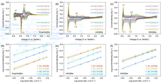 (a–c) CV curves at different scan rates and (d–f) log (scan rate) versus log (peak current) fitting plot for the two cathodic peaks (C1, and C2) and the two anodic peaks (A1, and A2) in graphite‖Na, UAG‖Na, and NAG‖Na half-cells.