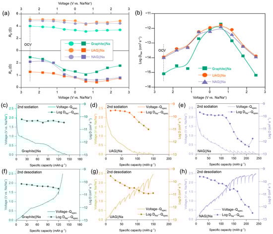 (a) The internal resistance values (RB and Rct) vs. voltage and (b) sodium ion diffusion coefficient (DNa+) were calculated from the EIS data for graphite‖Na, UAG‖Na, and NAG‖Na half-cells at each voltage during the first cycle. GITT test and the calculated sodium ion diffusion coefficient (DNa+) during second cycles for the (c,f) graphite‖Na, (d,g) UAG‖Na, and (e,h) NAG‖Na half-cells.