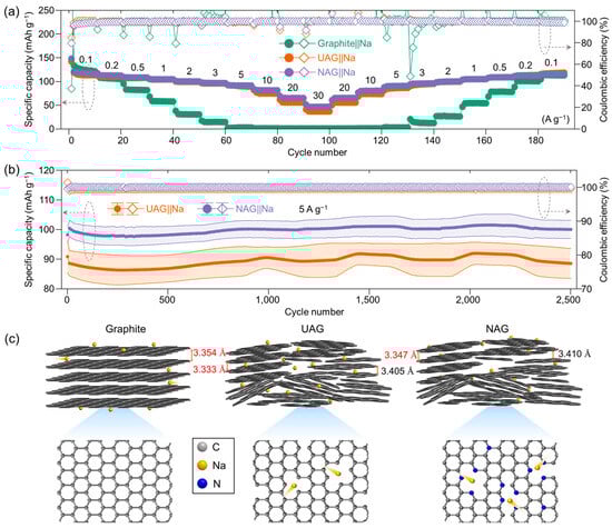 (a) Rate capability of graphite‖Na, UAG‖Na, and NAG‖Na half-cells at current densities ranging from 0.1 to 30 A g−1, and then back to 0.1 A g−1. (b) Long cycle stability of UAG‖Na and NAG‖Na half-cells at 5 A g−1. (c) Schematic of Na+ ion kinetics for the samples at high current density during cycling.