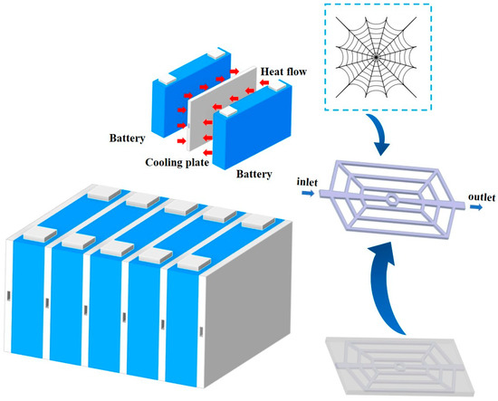 A bionic liquid cooling plate with a spider-web channel is designed for battery thermal management. The prismatic lithium-ion battery used in this paper is of the model CATL2795148-51Ah. Its cathode material is LiNi0.8Co0.1Mn0.1O2, the anode material is graphite, and the electrolyte is LiPF6. The detailed characteristic parameters are listed in Table 1. The geometric model of the battery liquid cooling system is shown in Figure 1, which consists of five batteries and six liquid cooling plates arranged alternately. It is noted that the liquid cooling plates are positioned on the large sides of the batteries. When prismatic lithium-ion batteries are grouped, the large sides with the highest temperature come into contact, making it difficult for the heat generated by the batteries to dissipate in time, leading to heat accumulation. As such, a side-contact cooling method is adopted to enhance the heat dissipation of the batteries. To save computational resources, a representative cooling unit will be used as the subject of subsequent simulations, namely a liquid cooling plate in direct contact with two batteries. Considering that aluminum has good thermal conductivity and lightweight properties, it is selected as the material for the liquid cooling plate. Water flows through the channels in the liquid cooling plate, absorbing heat from the batteries. The physical parameters of the liquid cooling plate and coolant are presented in Table 2.