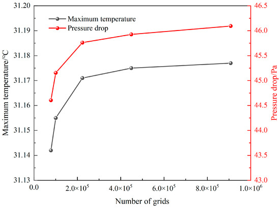 The accuracy and speed of computations are affected by the number of grids in the model. To enhance the reliability of the simulation results, the grid independence test is performed. The polyhedral grid configuration is adopted for the grid division. The Tmax of the battery and ΔP are used as criteria for the grid independence test. The simulation results for various grid numbers are shown in Figure 2. It is indicated that with the number of grids increasing, the Tmax and ΔP tend to stabilize, and when the number of grids is more than 448,838, the Tmax and ΔP increase by 0.01% and 0.36%, respectively. Considering both computational accuracy and cost, the grid number at this point is ultimately selected for subsequent simulations.