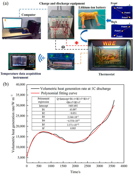Based on the principle of the calibrated calorimetry method [34], the heat generation rate of a 51 Ah prismatic lithium-ion battery was tested. The experimental setup for the heat generation rate test was shown in Figure 3a. The testing system mainly included the battery, charge/discharge equipment (NEWARE CT-4008-5V60A-NFA, manufactured in China), thermostat (WBE 3SDG100L, manufactured in China), computer, and temperature data-acquisition instrument (HIOKI LR8410R, manufactured in Japan). Six thermocouples were distributed along the diagonal lines of the front and rear surfaces of the battery. The positive and negative terminals of the lithium-ion battery were connected to copper wire terminals using bolts and washers. The surface of the battery was covered with a 10 mm thick aerogel layer, which was secured with high-temperature tape to reduce heat dissipation during the experiment and establish an approximately adiabatic environment. The wrapped battery was placed in the thermostat, and all thermocouples were connected to a real-time data-acquisition instrument. The charge/discharge equipment was connected to the battery through copper wire terminals, and the computer controlled the discharging programs of the battery. Figure 3b showed the transient volumetric heat generation rate of the battery calculated using the calibrated calorimetry method under the 1C discharge rate.