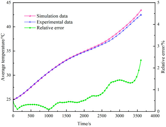 To validate the accuracy of the battery thermal model, a numerical transient simulation is conducted on the thermal behavior of the battery under 1C discharge condition. Considering that the heat generation rate of the battery during 1C discharge varies with time, the user-defined function (UDF) compiler in Fluent 2021R1 is employed to define the battery heat source. A simulation calculation is performed for the battery discharging at 1C in an ambient temperature of 25 °C, and the calculated average surface temperature of the battery is compared with the experimental temperature data from the 1C discharge of the battery, as shown in Figure 4. The maximum relative error between the simulated temperature and the experimental temperature does not exceed 3%. The results demonstrate good consistency, indicating that the battery thermal model possesses high reliability and is suitable for simulation analysis of battery cooling.
