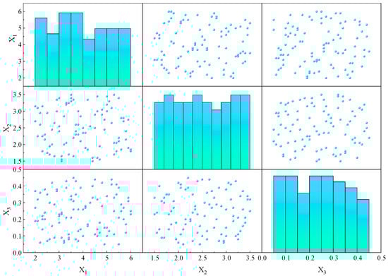 Before establishing the surrogate model, sample points must be obtained through experimental design. Based on the sensitivity analysis of the factors, as will be discussed in the later part of this paper, the channel width (X1), channel depth (X2) and inlet velocity (X3) are selected as the input variables for the experimental design, with the Tmax, ΔTmax, and ΔP as the output variables. The optimal Latin hypercube sampling (OLHS) method is employed for case sampling since it allows the sample points to be more uniformly distributed across the entire sampling space, unlike the Latin hypercube sampling (LHS) method [35]. A total of 95 sample points are selected using the OLHS method, and their distribution is plotted in Figure 5, which displays relatively uniform distribution within the design range. Subsequently, numerical simulations are conducted to calculate the output response values for each sample point.