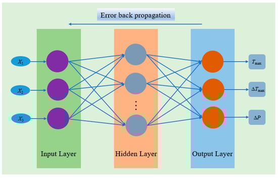 BPNN is a feedforward neural network trained using the back propagation algorithm, suitable for solving complex nonlinear problems. As illustrated in Figure 6, the BPNN model comprises an input layer, a hidden layer, and an output layer. The input layer includes three nodes, which are the channel width (X1), the channel depth (X2), and the inlet velocity (X3). Similarly, the output layer includes three nodes, corresponding to the Tmax, ΔTmax, and ΔP. The number of hidden nodes is crucial for the prediction accuracy of the network. Therefore, the effect of the number of hidden nodes on prediction performance is taken into account. The number of hidden nodes, h, can be calculated by Equation (12). The output response values of the sample points obtained from numerical simulations are utilized to construct the dataset for the BPNN model, with 80% of the data allocated for training the surrogate model and 20% for testing the accuracy of the model.