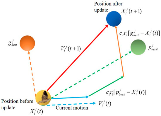The PSO algorithm is a heuristic intelligent optimization algorithm that simulates the foraging behavior of birds through iterative updating of particles to solve problems [36]. Each particle has its own unique position and velocity. The position of a particle stands for a potential solution, and its velocity determines the direction and magnitude of movement during the iteration process. The fitness function is used to evaluate the quality of each potential solution, and the entire population moves toward the optimal solution. Through continuous iteration of the velocity and position of particles, the optimal solution is obtained. The schematic diagram of the velocity and position updates during the iteration process is shown in Figure 7, and the corresponding update formulas are as follows: