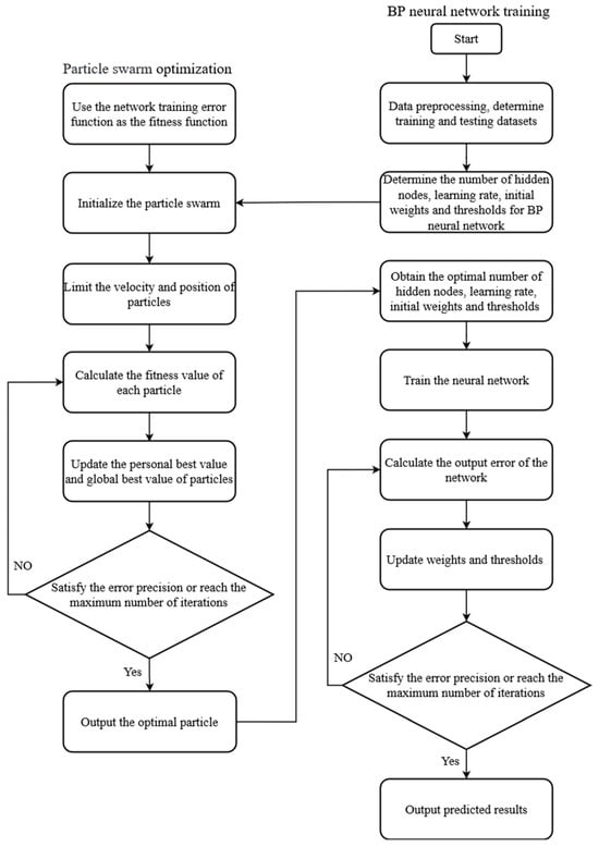 Based on the limitations of the traditional BPNN, this paper introduces the PSO algorithm to optimize the two critical hyperparameters of the BPNN, as well as the initial weights and thresholds of the nodes. Specifically, the PSO algorithm exerts its global search capability within the search domain by utilizing the prediction error of the BPNN as the fitness function of the PSO algorithm. This process continues until the algorithm identifies the optimal combination of the number of hidden nodes, learning rate, initial weights, and thresholds that satisfy the error precision requirements. These globally optimal solutions obtained after the algorithm terminates are assigned to the BPNN to achieve higher prediction accuracy. The specific algorithm flow is illustrated in Figure 8.
