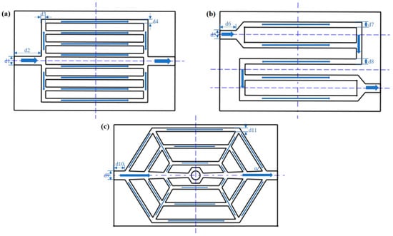 Types of channel structures: (a) Straight channel, (b) Serpentine channel, (c) Spider-web channel.