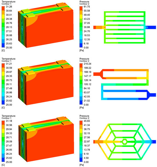 To demonstrate the cooling performance difference between the normal liquid cooling plates and the optimized spider-web liquid cooling plate. The temperature contour plots of the battery module are shown in Figure A1. The optimized spider-web liquid cooling plate has superior cooling performance, with the Tmax of the battery module reaching 28.17 °C and the ΔTmax of 2.53 °C. Compared to the serpentine and straight liquid cooling plates, the Tmax decreased by 0.69 °C (17.9%) and 0.54 °C (14.6%), respectively, while the ΔTmax decreased by 0.4 °C (13.7%) and 0.35 °C (12.2%). As such, the optimized spider-web liquid cooling plate is also applicable for module cooling.