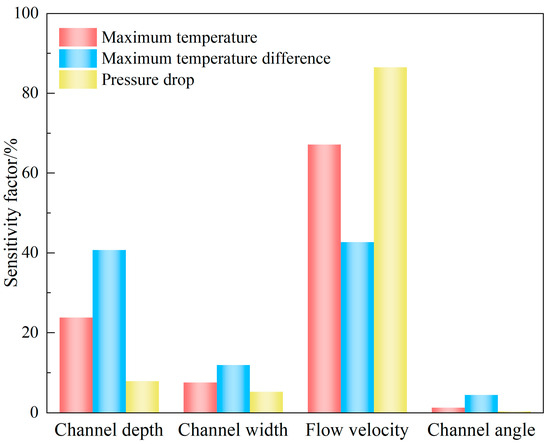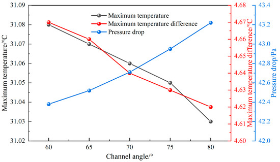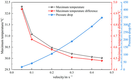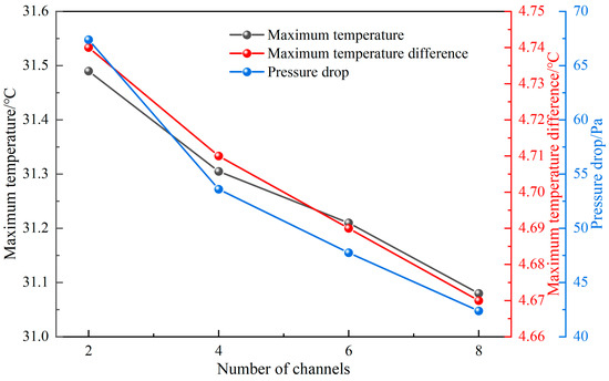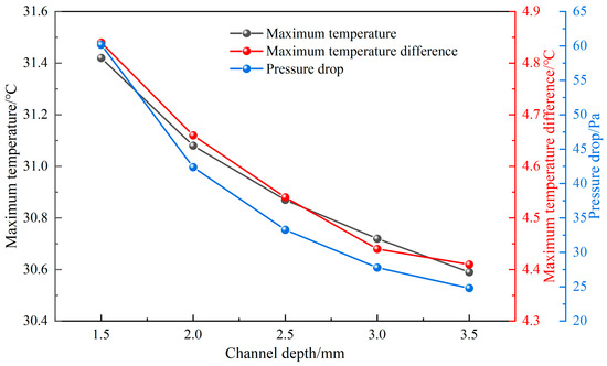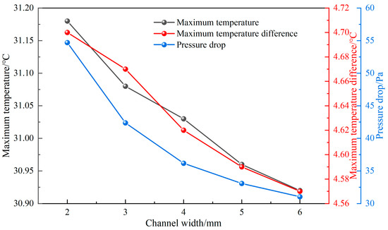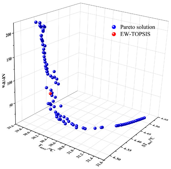 (3) By applying the entropy weight method, the weights for the Tmax, ΔTmax, and ΔP are 0.498, 0.225, and 0.277, respectively. Based on these weights and the TOPSIS decision-making method, a good balance between cooling performance and energy consumption is achieved when the channel width, channel depth, and inlet velocity are 6 mm, 3.4 mm, and 0.22 m·s−1, respectively. Compared to the initial structure, the Tmax and ΔTmax are reduced by 1.09 °C and 0.41 °C in the optimized structure, respectively, with an increase in ΔP by 21.24 Pa.