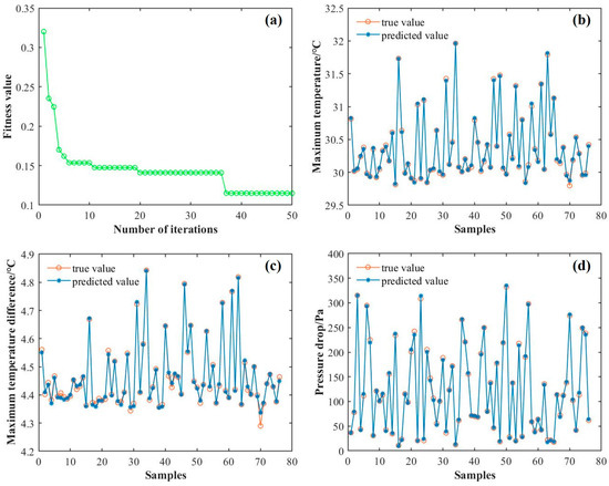 In most cases, the above methods for optimizing battery thermal management parameters primarily rely on numerical simulations and tedious case experiments. The diverse and complex combinations of different parameters result in the significant consumption of time and computational resources during the analysis and optimization processes. As diverse surrogate models and artificial intelligence algorithms evolve, large amounts of data can be processed quickly, improving work efficiency without human intervention. As such, many researchers have optimized BTMS using surrogate models and optimization algorithms. Due to the nonlinear characteristics of complex BTMS, the BPNN is used as a surrogate model for multi-objective optimization because of its advantages in handling complex nonlinear mapping relationships and strong self-learning ability. Li et al. [29] used an artificial neural network to establish the relationship between battery spacing, ambient pressure, and both the Tmax and ΔTmax and then improved the temperature uniformity of the battery module through optimized design. Chen et al. [30] showed that a deep learning neural network model provided more precise output predictions for the cooling performance of carbon/epoxy resin with a microchannel compared to the response surface model. Although progress has been made in performance prediction, the traditional BPNN has certain limitations as a surrogate model. The learning rate and the number of hidden nodes, which are critical hyperparameters affecting model training, are generally set based on personal experience and often require multiple human trials to optimize. Additionally, the initial weights and thresholds of the BPNN are generally initialized randomly, which would lead to the network getting stuck in local optima during training, thereby affecting the prediction performance of the model.