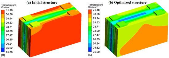 Temperature contour plots of the batteries: (a) the initial structure, (b) the optimized structure.
