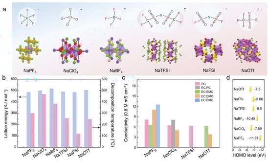 Chemical and physical properties of common sodium salts. (a) Geometric configurations. The 3D structures originate from the Material Project database (Purple: Na; orange: P; red: O; pink: B; blue: N; grey: C; yellow: S; for NaPF6, NaBF4, NaTFSI, NaFSI, and NaOTf, green corresponds to F; for NaClO4, green corresponds to Cl). (b) Lattice energy and decomposition temperature (Arrows indicate the corresponding y-axes). (c) Specific conductivity. (d) HOMO level. Reproduced under terms of the CC-BY license [30]. Copyright 2022, the authors, published by Wiley-VCH.