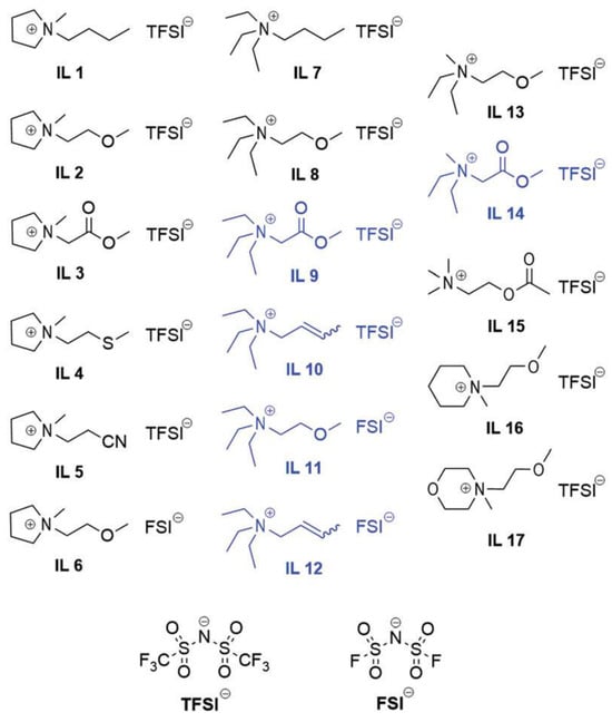 As mentioned above, ILs typically comprise cations and anions of rather different natures, and they have melting points well below 100 °C. These low melting points are due to reduced interionic interactions resulting from their bulky and irregular structures. In contrast, conventional molten salts feature tightly packed, rather symmetrical ions, leading to higher melting points. Their diversity and tunability of ILs derive from the existence of multiple combinations of the typical constituent ions, up to 1018 or more [53]. Figure 6 shows the most common ions involved in ILs for battery applications. In this context, an ideal IL should be an electrolyte with high ionic conductivity and high thermal and electrochemical stability.