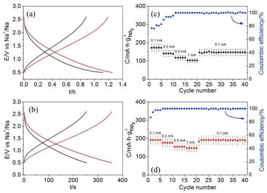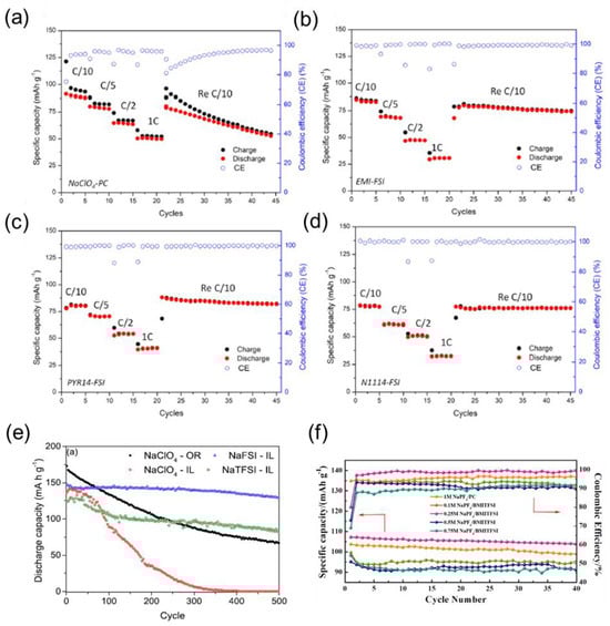 Some examples of the improvement in capacity retention for cathode materials in IL-based electrolytes compared with common organic electrolytes under ambient conditions are described in the following. The P2-type layered oxide Na0.84Li0.1Ni0.27Mn0.63O2 has been tested in different electrolytes: NaFSI-[C1C2im][FSI], NaFSI-[C4C1pyrr][FSI] and NaFSI-[N1114][FSI]. A comparison between the ILs and the NaClO4-PC electrolyte shows that the capacity exhibited is slightly higher in the organic electrolyte than in the IL-based electrolytes. However, the capacity retention and the cycling stability obtained is better for the IL-based electrolytes (Figure 10a–d) [125]. Another example is the performance study of P2-Na0.6Co0.1Mn0.9O2+z in [C4C1pyrr][TFSI] containing different sodium salts (NaTFSI, NaFSI, and NaClO4) by Do et al. [126], showing results comparable with those for a typical organic electrolyte (NaClO4-EC/PC). When the one-anion electrolyte NaTFSI-[C4C1pyrr][TFSI] is used, the capacity retention improves over that of the organic electrolyte.