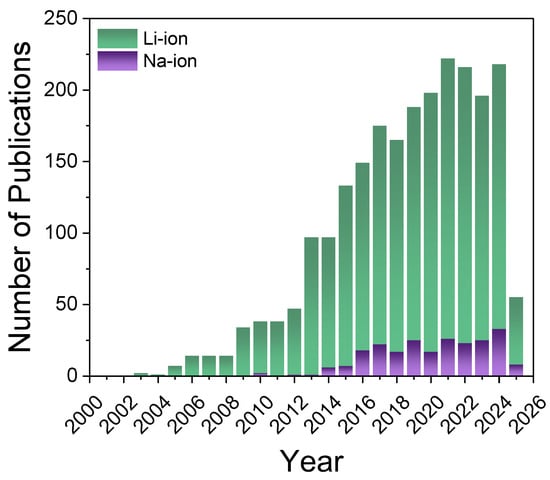 ILs have a history that can be viewed as relatively short. It started in the early 20th century when Paul Walden [38] was exploring the properties of molten salts. He found that [EtNH3][NO3] had a melting point of 12 °C. However, the potential of this breakthrough went unnoticed for a long time [39]. Interest surged in the 1980s [40,41,42,43,44] when researchers recognized their unique characteristics, such as negligible vapor pressure and high thermal stability, making them attractive for various applications in chemistry and engineering. In 1999, Solvent Innovation GMbH began to commercialize ILs with high quality [45]. Since then, ILs have gained attention for their potential in fields like catalysis [46] and electrochemistry [47,48,49] and as solvents for green chemistry [50]. It was not until the late 1990s that the application of ILs for rechargeable batteries began to be explored. Gray et al. [51] and Scordilis-Kelleya and Carlin [52] reported reversible Li and Na deposition/stripping using either LiCl or NaCl dissolved in a mixture of 1-methyl-3-ethylimidazolium chloride (MEIC) and aluminum chloride (AlCl3) as a room-temperature molten salt. Since 2004, the interest in ILs for batteries has experienced intensive growth, as shown by the number of publications in the field that have appeared per year (Figure 5).