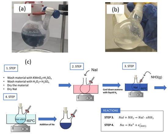 On the other hand, liquid ammoniates can be synthesized according to the procedure described by Herlem and co-workers [144]. Prior to the synthesis, all the glassware is cleaned and dried. The dried salt is placed in a reaction flask. An inert atmosphere is created, and the reaction flask is immersed in an acetone solution, which is cooled down to −60 °C. Next, an excess of anhydrous ammonia is condensed until the salt is fully dissolved, resulting in a colorless solution. The purification step is carried out by adding an alkali metalto the solution in excess, which triggers the appearance of the blue coloration characteristic of solvated electron solutions (Figure 12a). Solvated electrons are strong reducing agents, reacting with impurities such as H2O and O2. Finally, the solution (colorless) is left to slowly reach room temperature (Figure 12b).