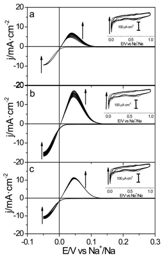 Hosokaba et al. [108] studied the stability and the electrochemical performance of [C2C1im]+ cation-based IL electrolytes at room temperature. The results show that the electrolyte comprising FSI− anions, NaFSI-[C2C1im][FSI], is more stable against reduction than the TFSI−-based electrolyte, NaTFSI-[C2C1im][TFSI]. In addition, NaFSI-[C2C1im][FSI] enables sodium plating, in co ntrast with the case of the NaTFSI-[C2C1im][TFSI] electrolyte. Sodium deposition/stripping was also observed to take place at room temperature on a Ni microelectrode in 0.1 M NaTFSI-[C4C1pyrr][TFSI], 0.1 NaTFSI-[N2,1,1,3][TFSI], and 0.1 M NaTFSI-[N6,2,2,2][TFSI] IL-based electrolytes. In 0.1 M NaTFSI-[C4C1pyrr][TFSI], the Coulombic efficiency (CE) was reported to be 75% [109], although in general, their values at room temperature were low, with a tendency to rise as temperature increases. In contrast, Wu et al. observed that the CE for Na deposition/stripping using NaFSI-[C2C1im][FSI] as an electrolyte was 98.1% at 90 °C after 250 cycles [110]. On the other hand, the deposition/stripping of Na on Ni and Cu collectors was carried out in a NaFSI-[C3C1pyrr][FSI] electrolyte at 80 °C (Figure 9a) [111]. The CE value for the sodium deposition/dissolution on Cu was shown to be higher than on Ni. In any case, super-concentrated IL-based electrolytes seem to generate a beneficial SEI layer on the Na metal electrode [112]. The effect of water addition on the SEI formation on Na metal was studied in a super-concentrated NaFSI-[C3C1pyrr][FSI] electrolyte. It was demonstrated that the SEI formation is strongly influenced by water addition, which results in distinct chemical composition and morphology. Interestingly, cycling stability was enhanced in Na cells with a water concentration of ~1000 ppm [113,114].