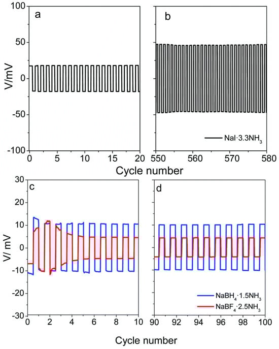 A family of liquid electrolytes attracting considerable interest in recent years is constituted by ionic liquids (ILs). These are pure electrolytes with melting points below 100 °C and preferentially liquid under ambient conditions. ILs are either organic salts or inorganic–organic hybrid salts [35,36]. The nature of the ILs gives them unique properties such as high ionic conductivity, excellent thermal, chemical and electrochemical stability, negligible vapor pressure, and high miscibility with other compounds [37]. This review focuses on these electrolytes. Within this family of electrolytes, particular emphasis is placed on the so-called liquid ammoniates, which are ammonia solvates (of sodium salts in the case under scope) characterized by being stable liquids under ambient conditions. They remain largely unexplored for their application in secondary batteries.