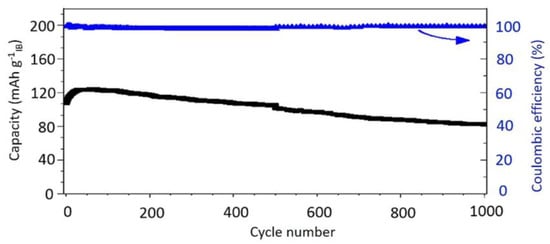 Considering again the study of P2-Na0.6Co0.1Mn0.9O2+z by Do et al. [126], the best performance was not obtained for the TSFI− one-anion-type electrolyte but for the NaFSI-[C4C1pyrr][TFSI] two-anion-type electrolyte, with an initial capacity of 147 mAh g−1 and a capacity retention value of 90% after 500 cycles at 50 mA g−1 (Figure 10e). The improvement in performance in the mixed-anion electrolyte was related to the formation of a thinner conductive CEI and a more favorable SEI on the Na metal anode in comparison with the organic electrolyte. Similarly, Chagas et al. [132] demonstrated excellent electrochemical performance for an Na0.45Ni0.22Co0.11Mn0.66O2/Na cell using a 10 mol% NaTFSI [C4C1pyr][FSI] electrolyte. The cell delivered approximately 200 mAh g−1 with an average voltage of 2.7 V, resulting in a specific energy density of 550 Wh kg−1 [132].