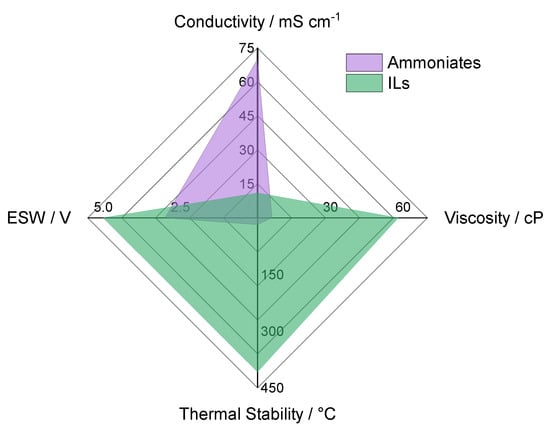 The ideal properties of the SIB organic electrolytes shown in Figure 4 also apply to ILs. The performance of ILs in an electrochemical device is influenced by the structure and behavior of their constituent ions. It is vital to ensure a rapid transport of the electroactive species to and from the electrode surface. In this regard, ionic conductivity, diffusion rate, and transport number become relevant.