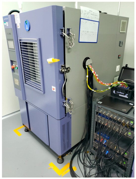 To ensure the reliability of the temperature–SOH relationship, all experiments were conducted in a controlled environment with a constant ambient temperature of 25 °C. The battery was placed in a KOMEG ET-403R thermal chamber, which provided precise temperature control (±0.5 °C) and minimized the influence of external temperature fluctuations. Each test step was conducted only after the overall temperature of the battery had stabilized. The direct-current internal resistance (DCIR) of the battery was measured at 100%, 90%, and 80% SOHs. Finally, the battery was disassembled at various SOH levels to examine the surface morphology changes in the anode electrode. Throughout the experiment, temperatures at different locations on the battery were continuously monitored to accurately capture the thermal characteristics. The overall testing setup is shown in Figure 1.