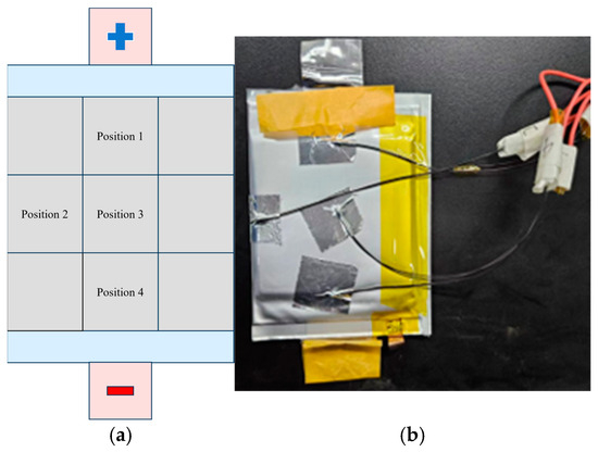 Pouch battery and NTC sensor setup: (a) pouch battery layout and (b) NTC sensor placement on battery.