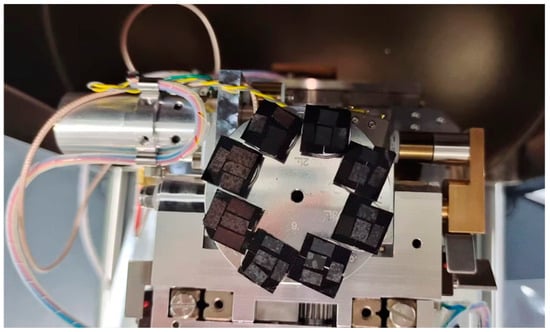 After completing all tests, the battery was charged to 100% SOC at a relatively low rate of 0.33 C to ensure that lithium ions were fully embedded in the anode material. The disassembly process was carried out in a low-humidity glove box filled with inert gas. The aluminum casing of the battery was carefully cut open using ceramic scissors, and the internal anode and cathode electrodes were extracted and separated to prevent short circuits. The anode electrode was thoroughly washed with an electrolyte solvent to remove residual electrolyte and impurities from its surface. The integrity, flatness, and color changes in the anode electrode were observed. In the low-humidity environment, samples were cut from different locations for microscopic examination. The sample electrodes were affixed to a pin stub using double-sided carbon tape and placed into a 9-hole sample holder, as shown in Figure 4. A Zeiss GeminiSEM 300 (Carl Zeiss AG, Oberkochen, Germany) Scanning Electron Microscope (SEM) was used to capture electron images at a magnification of 20,000× [23], providing detailed surface morphology of the electrode.