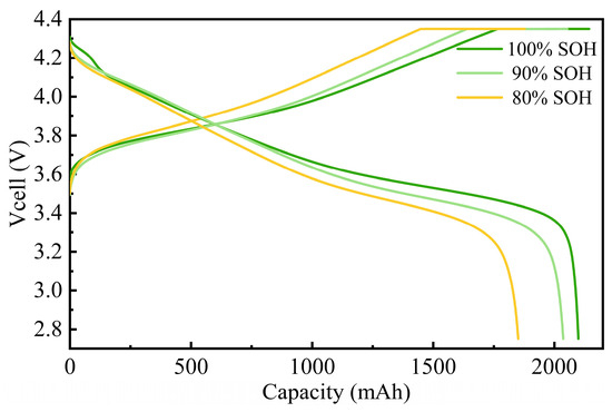 The charge–discharge voltage curves at 100%, 90%, and 80% SOHs are shown in Figure 6. These voltage curves reveal that, during the initial stage of charging, the voltage rises rapidly. In the middle section of the charging curve, the voltage increase slows, indicating that most of the capacity is charged during this phase. When the voltage quickly reaches 4.35 V, the constant-current phase ends, and the constant-voltage charging phase begins. During this phase, the charging current gradually decreases until the battery is fully charged, preventing overcharging and potential damage [26]. At 100% SOH, the battery enters the constant-voltage phase at 82.4% SOC. At 90% SOH, this transition occurs at 79.9% SOC, and at 80% SOH, it occurs at 77.2% SOC.